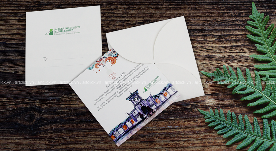 Thiệp mời Tiệc Endyear Aurora Investments - bìa giấy, ruột cán màng, thành phẩm bì thư độc đáo